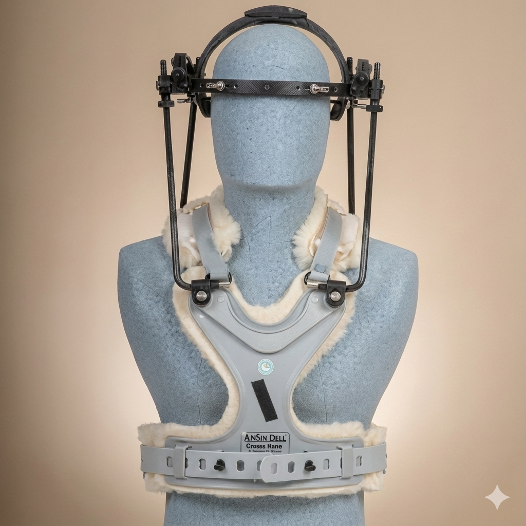 The Halo Brace is a specialized cervical orthosis consisting of a metal ring secured to the skull with pins and connected to a rigid vest. It provides maximum immobilization of the cervical spine.
