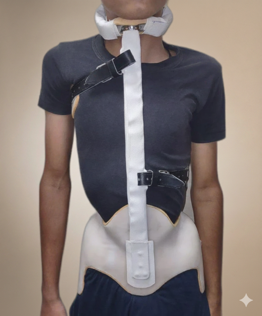 The Milwaukee Brace is a cervico-thoraco-lumbo-sacral orthosis (CTLSO) featuring a pelvic girdle connected to a neck ring via vertical metal bars. It’s designed for comprehensive spinal support from the cervical to sacral regions.